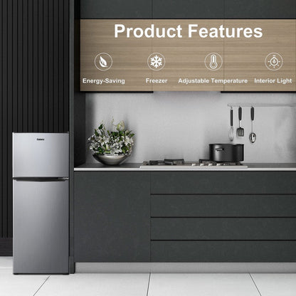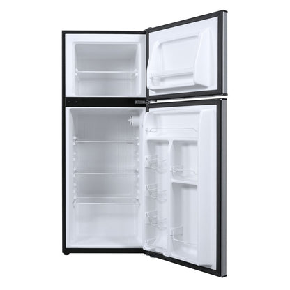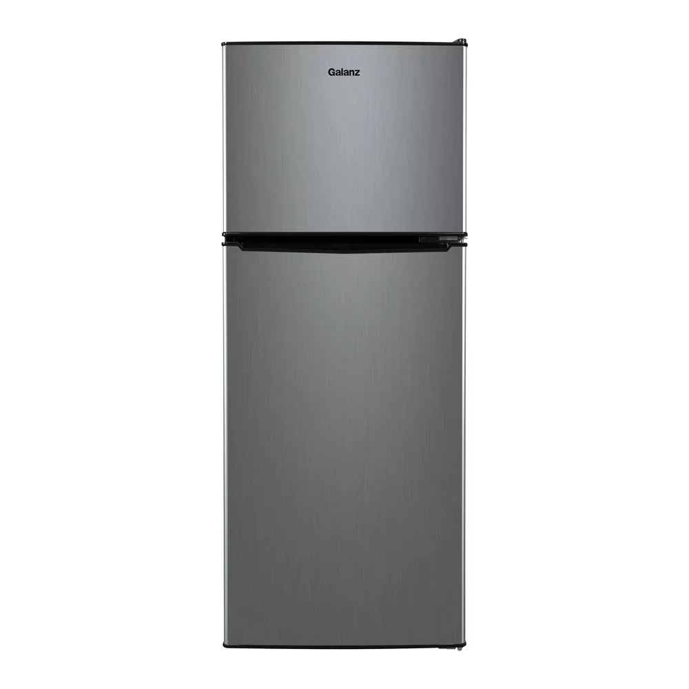Enjoy the convenience of having your favorite chilled food, drinks or snacks whenever you want with the Galanz 4.6 cu ft 2 door mini fridge with stainless-steel look and top freezer. The Galanz 4.6 cu ft fridge will enrich your kitchen, rec room or home office with different styles. The Galanz 4.6 cu ft 2 door mini fridge features an adjustable thermostat, separate freezer compartment, bright interior lighting, removable glass shelves and handy can dispensers. The convenient reversible doors allow you to choose to open from the left or right side making the Galanz 4.6 cu ft 2 door fridge suitable for any layout.