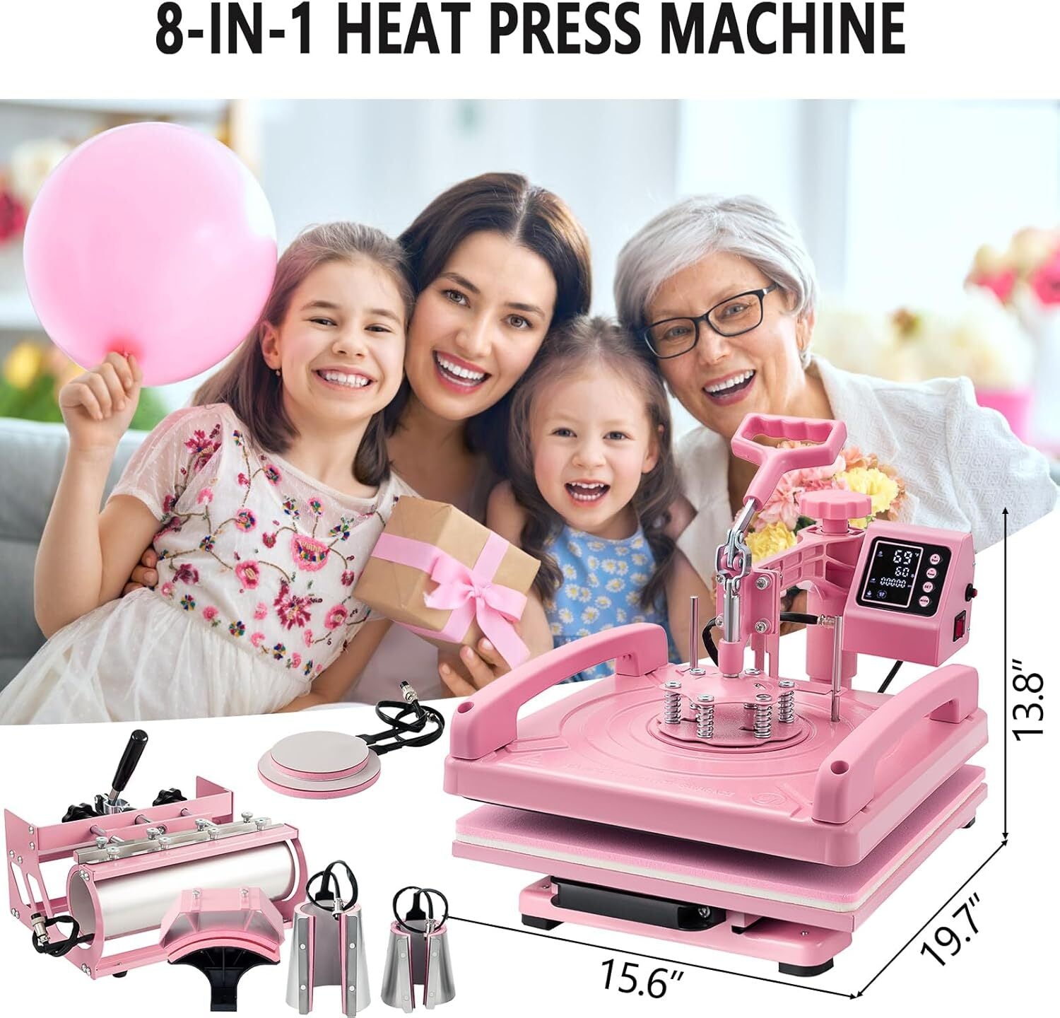 It can transfer colorful pictures and characters of sublimating and dissolved printing ink onto ceramics, glasses and textiles such as cotton, flax, chemical fiber, nylon, etc. This all-in-one press includes flat platen, mugs and plates.