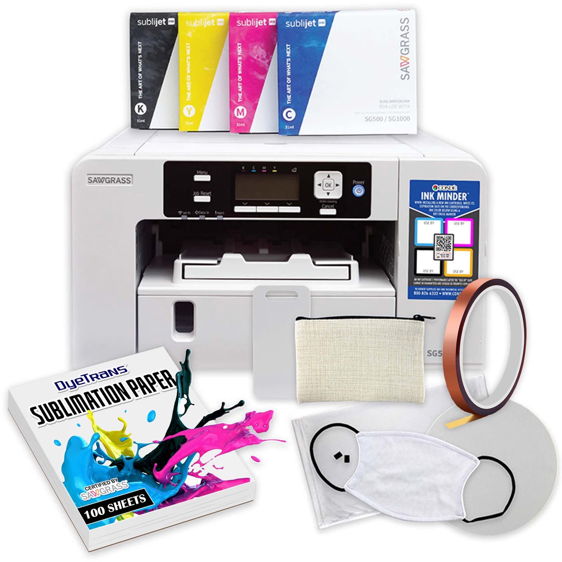 Sawgrass SG500 Sublimation Printer with SubliJet UHD Standard Kit Bundle for Sublimation Blank Printing. Includes Samples, Subli Ink, Heat Tape & Dispenser, Beginners Guide, & Paper.