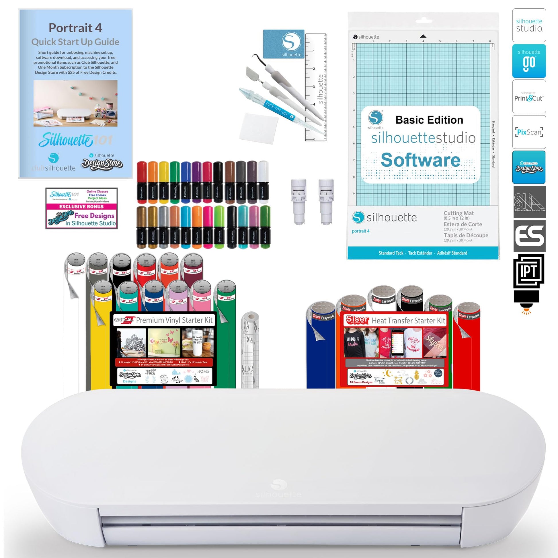 This bundle comes with Silhouette Studio Basic Edition Software, the AUTOBlade Type B, (1) 8.5-inch Standard hold Mat, 110v Power Cord, (36) 9 in x 12 in sheets of Oracal 651 vinyl (assorted colors), 20 ft Roll of LUXIA transfer Tape, a 1mm Premium blade, and Sketch pens basic pack. This bundle also comes packed with helpful information to get you started with the Silhouette Studio and CAMEO Machine from Silhouette 101 and bonus designs.