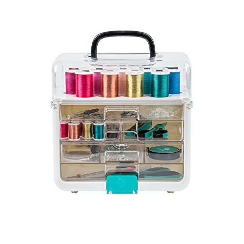 The Singer Sew It Goes is the perfect portable sewing box for projects on the go or at home. Its sleek, transparent travel case and customizable drawers allow easy access to its thread organizer and other sewing supplies. The Sew Essentials+ comes fully stocked with 18 machine sewing thread spools (150 yards each) and 24 hand sewing thread spools (25 yards each) in a variety of colors, 30 assorted hand needles, 5. 5 inch fabric scissors, a 60 inch tape measure, a pin cushion with emery, 100 dressmaker pins, three needle threaders, three thimbles, a seam ripper, buttons, safety pins, and fasteners. When finished, just close and latch the sew kit and it’s ready to go.